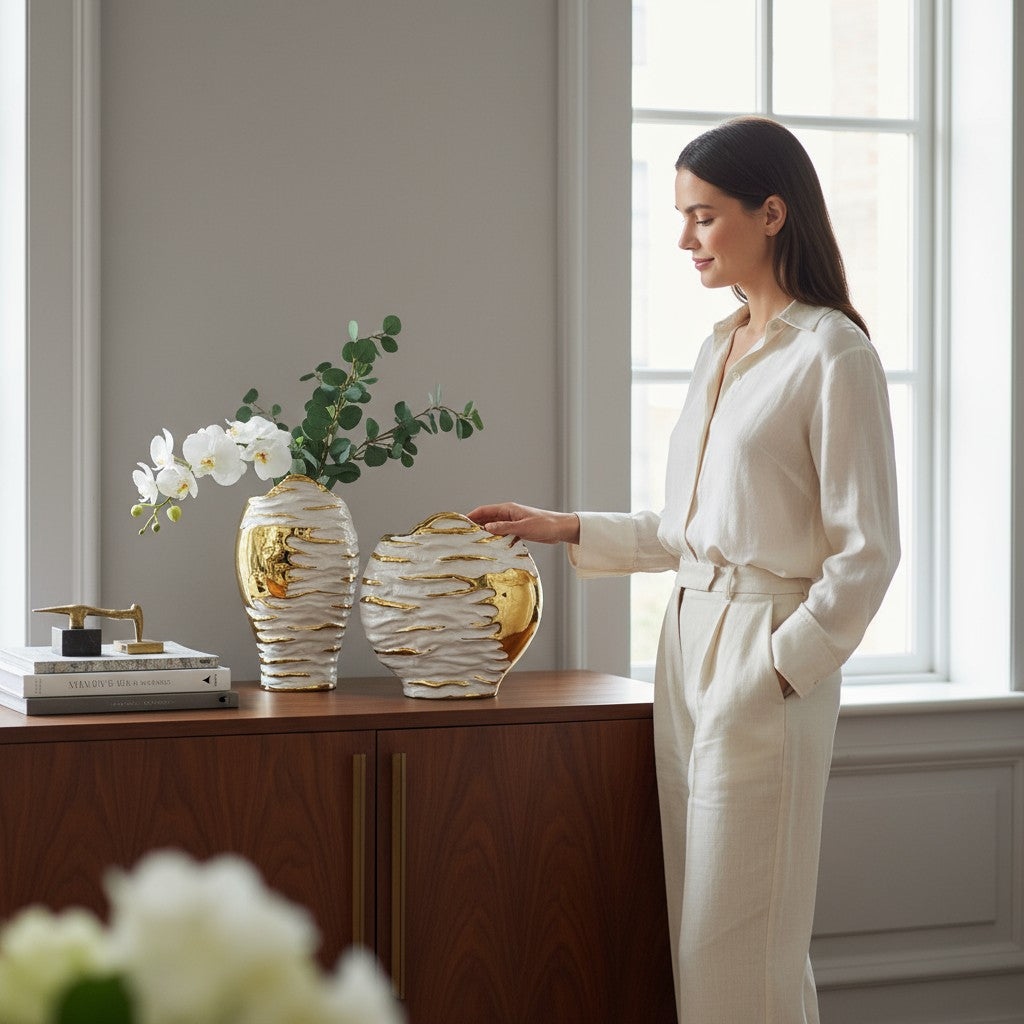 The Terra Eclipse Designer Vase is a bold convergence of earth and artistry. Its matte charcoal base contrasts beautifully with metallic accents that trace across its surface like streaks of moonlight. Handcrafted with precision, each piece reveals slight variations that celebrate individuality and imperfection — the hallmarks of true craftsmanship. With its sculptural presence and luxurious texture, it effortlessly becomes the focal point of any room. Perfect for statement florals or minimalist styling, the Terra Eclipse Vase speaks to modern elegance rooted in natural inspiration.